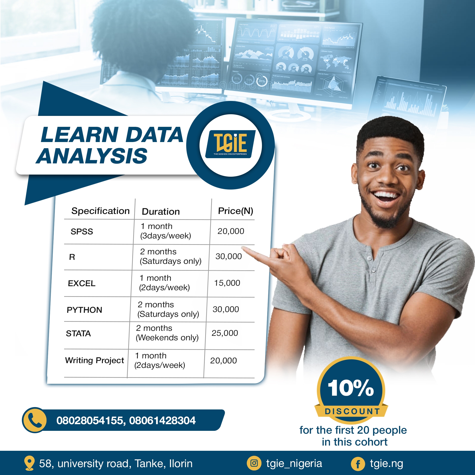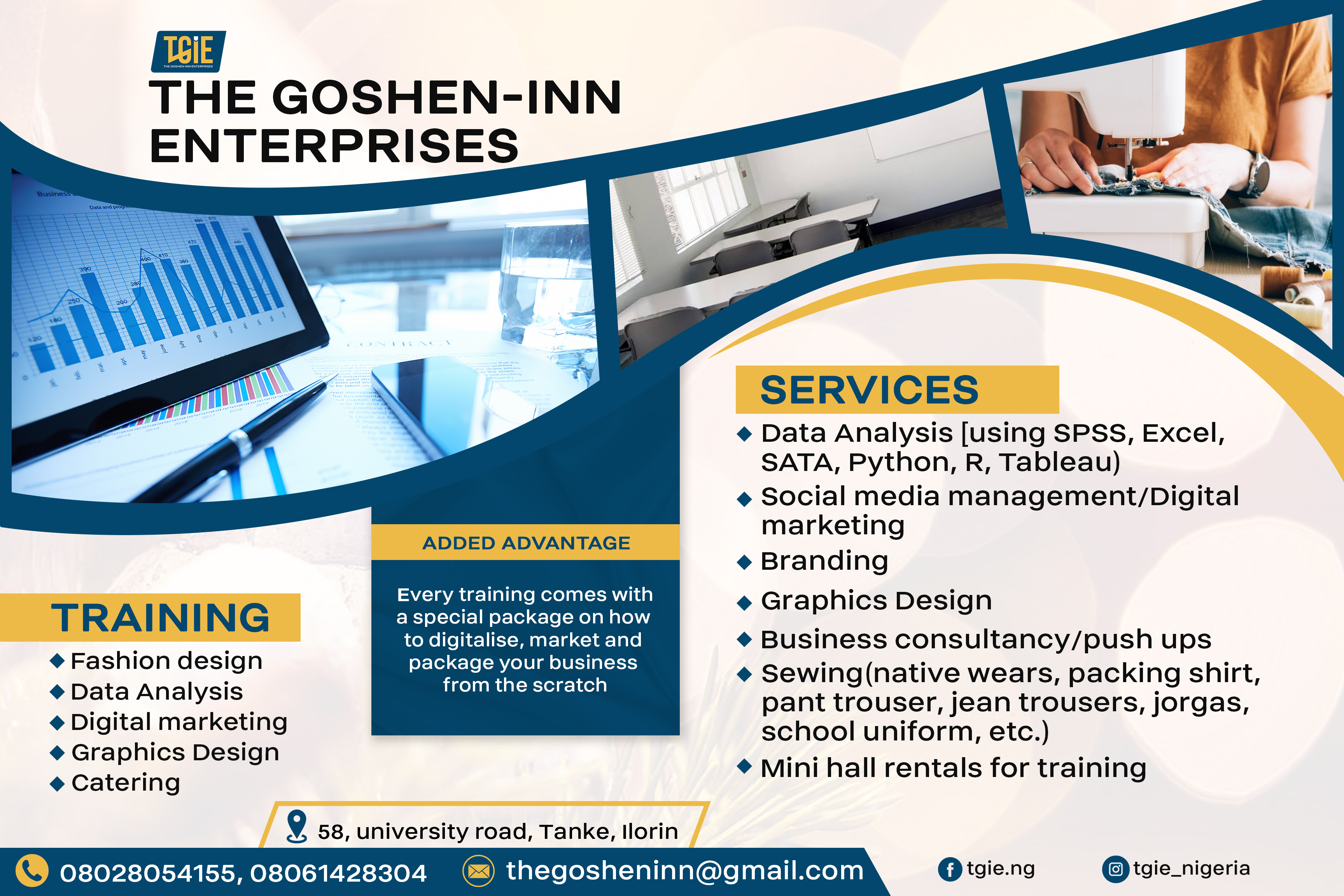We are committed to training entrepreneurs that will offer quality and profitable services with godly values. We also offer data analysis, digital marketing, fashion design and business push-up services.